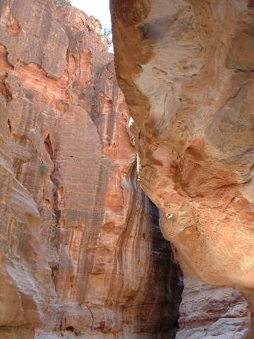 The siq, the onlt access to the ancient city of Petra, is a narrow opening, originated from tectonic forces in the magnificent coloured sandstone.