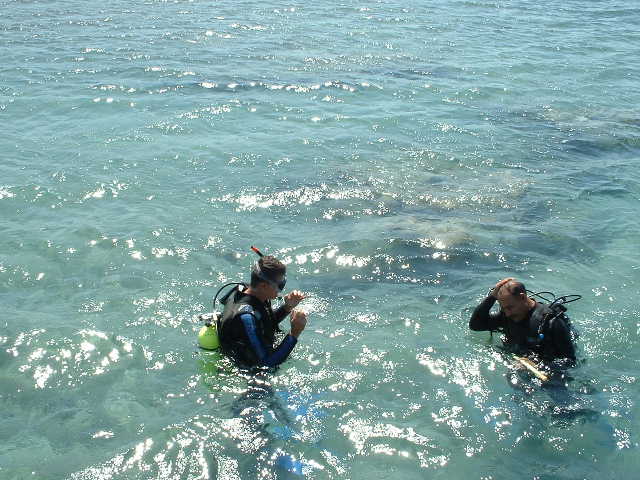 The first 4 dives are officially confined water dives. Normally in a swimming pool but here between the corals. The course progresses quickly. Every day an exam and many many skills. Then the rest of the air using while swimming between the corals, op to 15 meter deep.